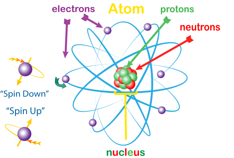 Ons lichaam bestaat uit cellen die zijn opgebouwd uit nog kleinere deeltjes: moleculen. Elk molecuul is opgebouwd uit atomen. Zo is een water-molecuul opgebouwd uit 2 atomen H(waterstof) en 1 atoom O (zuurstof): H20. Eén atoom bestaat uit een kern waarom heen electronen met onvoorstelbaar hoge snelheden cirkelen. Bovendien spinnen die electronen om hun eigen as, een beetje vergelijkbaar met de draaiing van de Aarde om haar as, waardoor de Zon in het Oosten opkomt en in het Westen ondergaat.