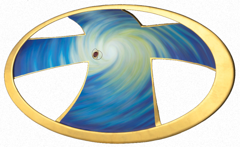 When I thought I was finished, I felt that something had to be in front, and I hung a red stone in front of it, set in an Akaija symbol. But we only got the name ‘Akaija’ a year later in 2005. At that time, we only had the shape. I called it Faith because it is a fusion of all conceivable religions (crosses) in the world, so of all the ways people connect with Above: the Christian cross with a longer lower arm, the Maltese cross, the Celtic cross with a ring around it, etc. Even the Holy Grail is reflected in the bowl shape.